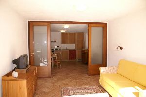 | Die Ferienwohnung Bellavista (ca. 60 qm) befindet sich in einem alleinstehenden Haus am Hang, ca. 100 m unterhalb des Hotels La Vigna. Parterre mit eigenem Eingang, der in den studioähnlichen Wohn- bereich mit Schlafcouch und TV führt. Daran schließt sich über eine Fensterflügelwand die Küche an. | Das Schlafzimmer ist mit einen Doppelbett aus- gestattet, das in 2 Einzelbetten geteilt werden kann. Ferner gibt es ein Bad. Aus dem Schlafzimmer und dem Wohnbereich gibt es jeweils separate Zugänge zum Garten, von wo man einen wunderbaren Blick auf das Meer und die Berge hat. |